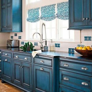 Винтажные кухонные шкафчики узнаваемы: яркие, с необычной фурнитурой. В целом кухонные гарнитуры невысокие, их не делали под потолок, да и верхние шкафы были достаточно компактными.